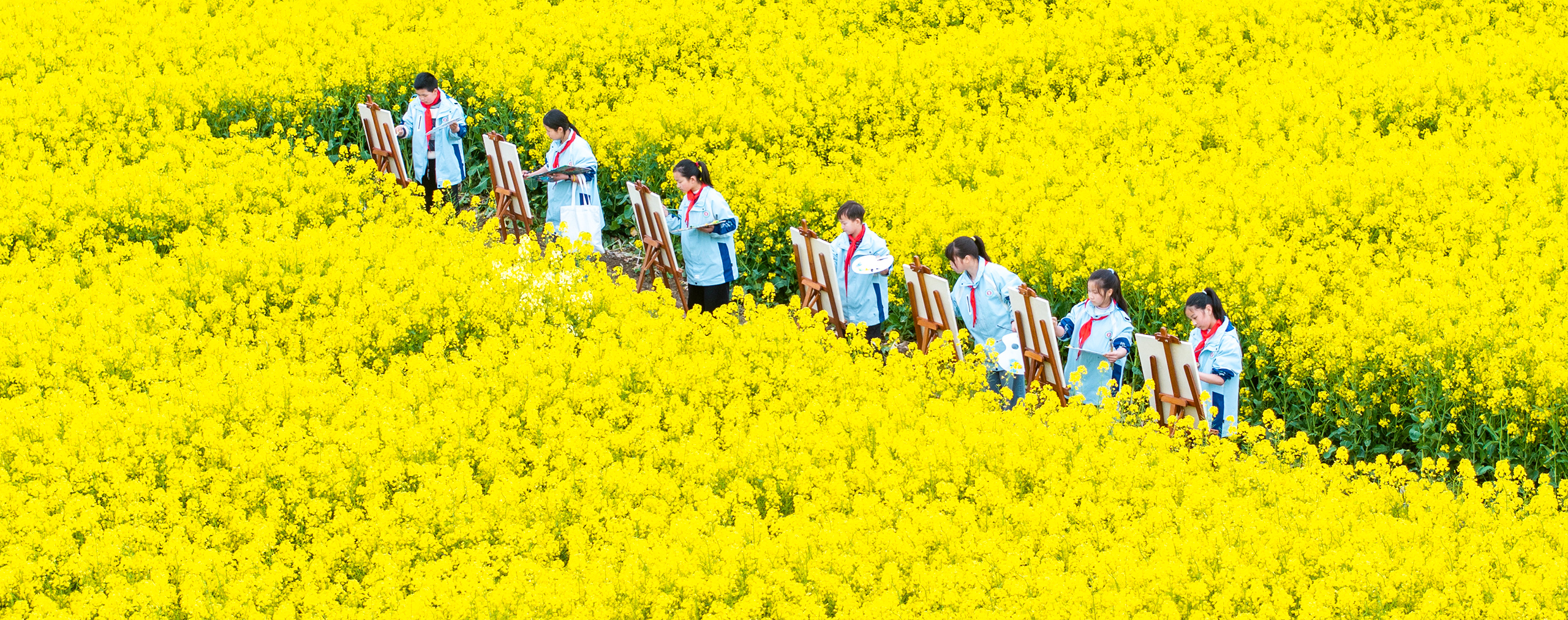 油菜花田间画春天 江苏省南通市通州区东社学校油画社团小学生在老师的带领下,来到油菜花田间,开展“童笔绘春天”主题采风活动,同学们用手中的画笔描绘春天美景,感受春天的气息。