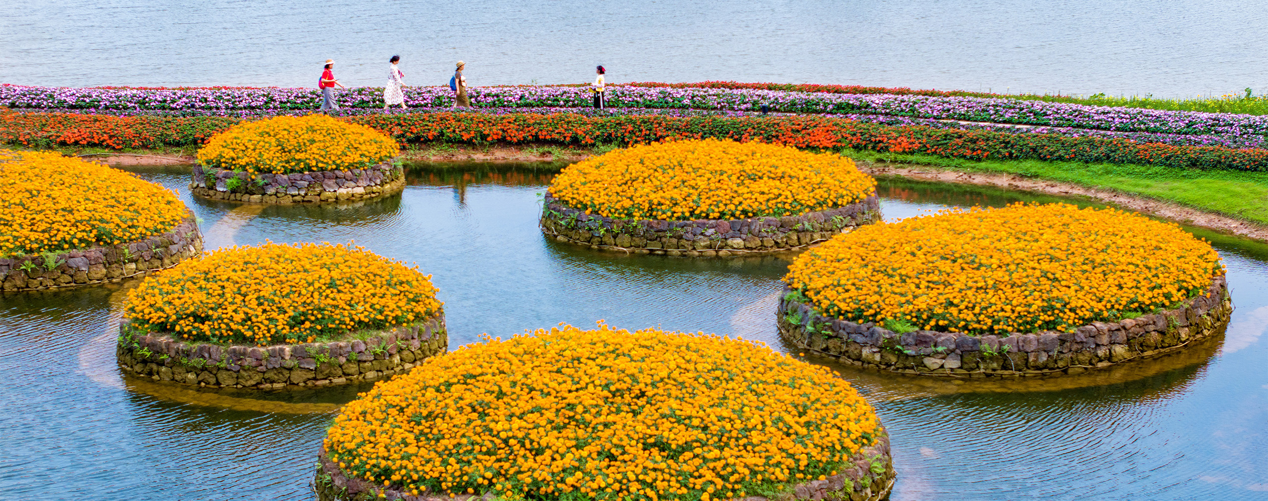 花海映春湖 广西壮族自治区南宁市青秀山风景区丘石花园内繁花盛放,碧水环绕花岛,各色花带沿步道铺展,山石绿植相映成趣,绘就绚烂春日盛景