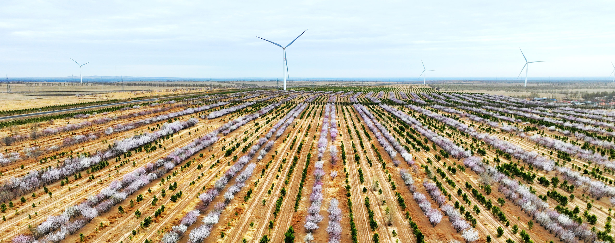 风机沐春 繁花映绿 内蒙古赤峰市敖汉旗黄羊洼镇风电场,杏花盛开,松树绽绿,构成了一幅美丽的春景图。