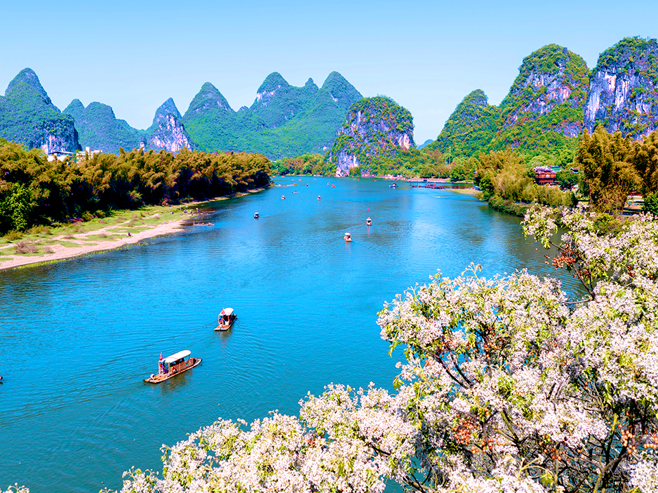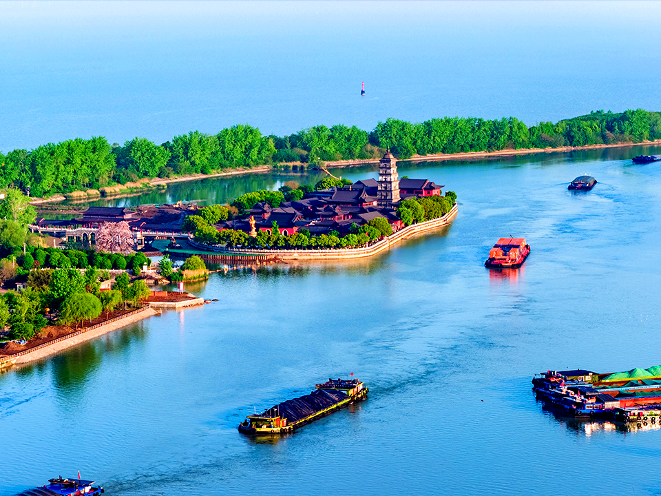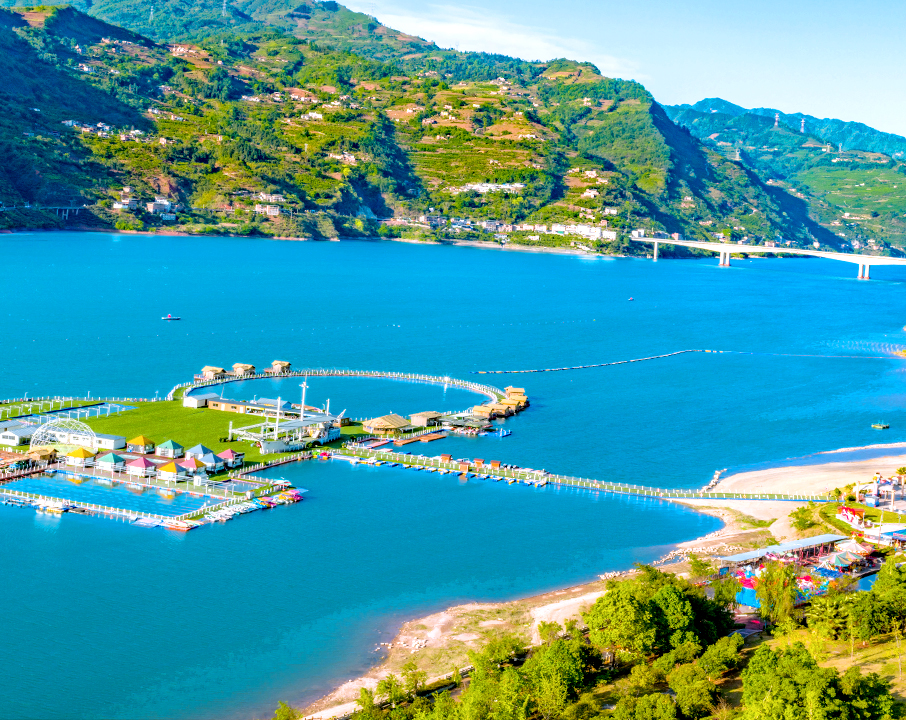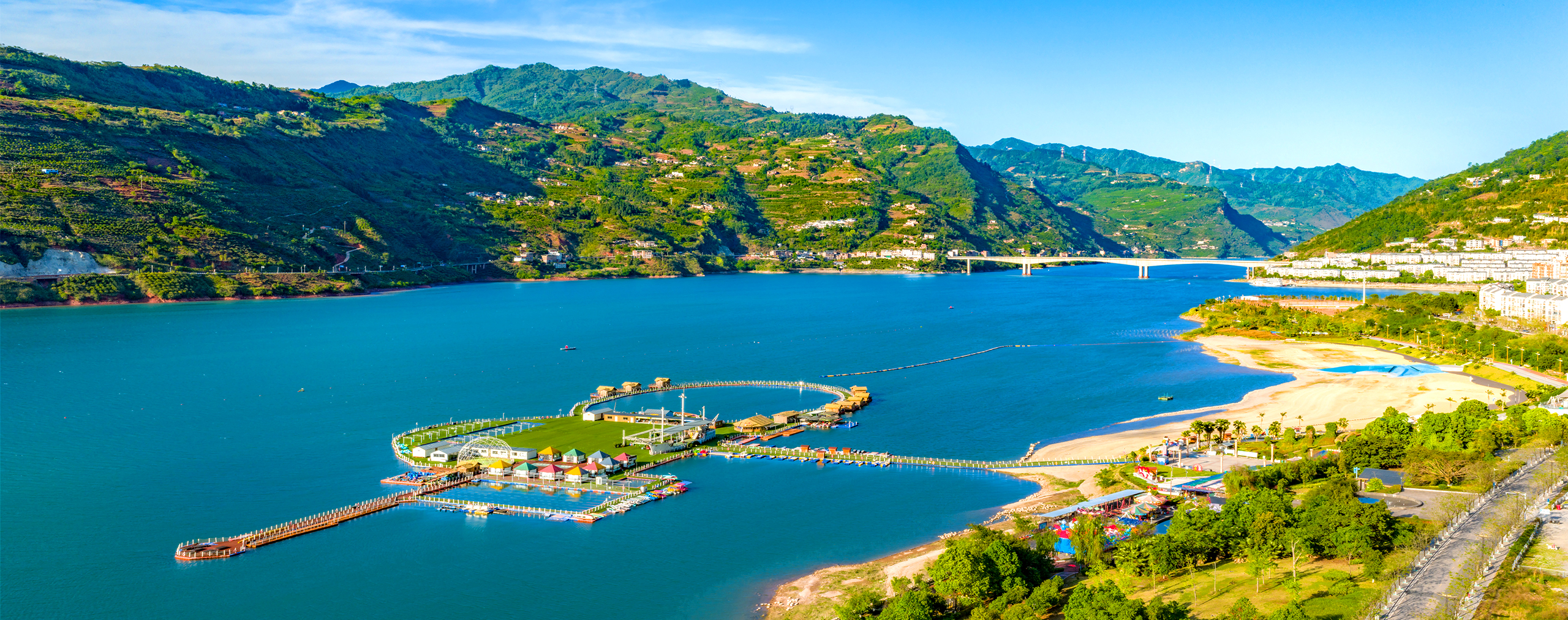 云南省昭通市,金沙江流域下游绥江段天蓝、水碧、山清、岸绿,一派春意盎然,景美如画。