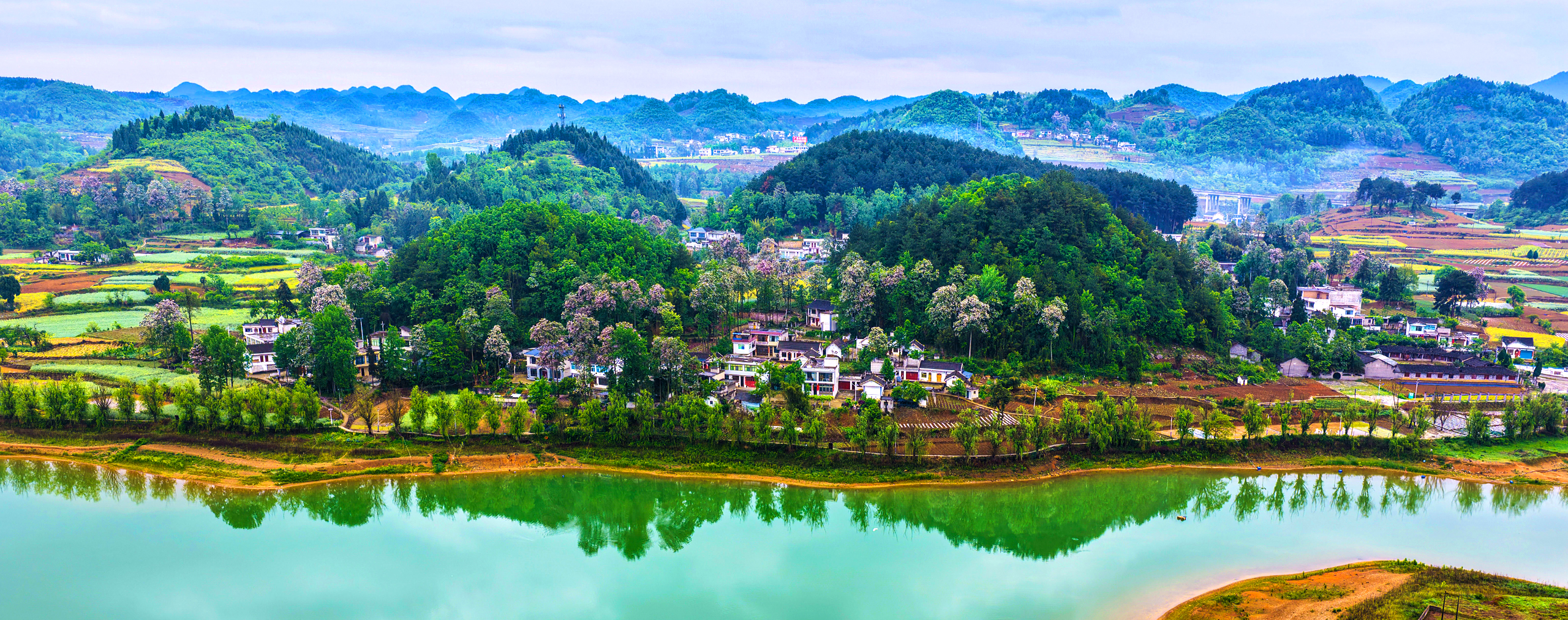 贵州省黔西市绿化白族彝族乡大海村的大海子湖泊,碧水蓝天、翠柳成荫,与山村农家房舍交相辉映,春意盎然、美如画卷。