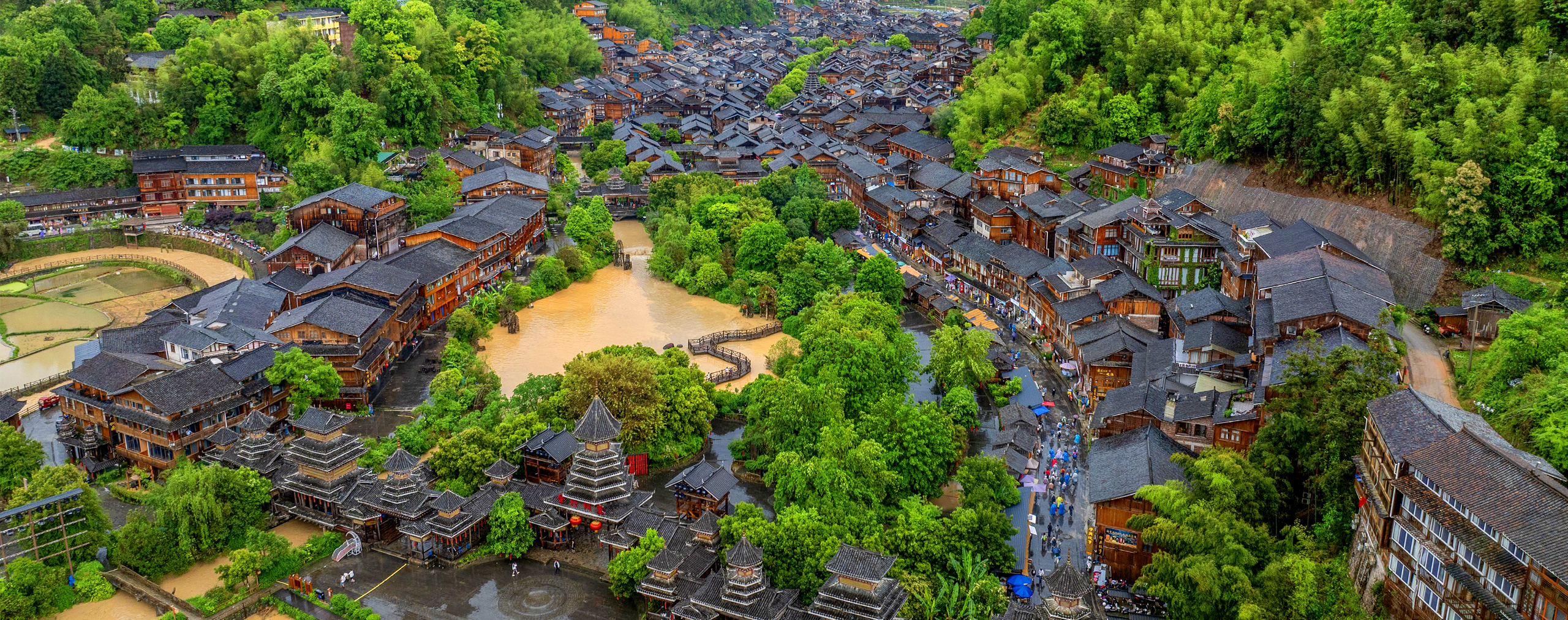 暮春时节,贵州省黎平县肇兴侗寨层楼叠榭与吐翠林木相映成趣,宛如一幅美丽乡村生态画卷。