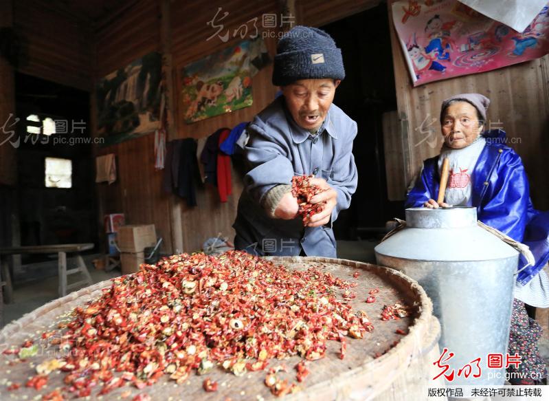 图为汪岩林一边用残肢将晒好的干辣椒储存到铁皮罐中,一边和妻子聊天。(张卫国)