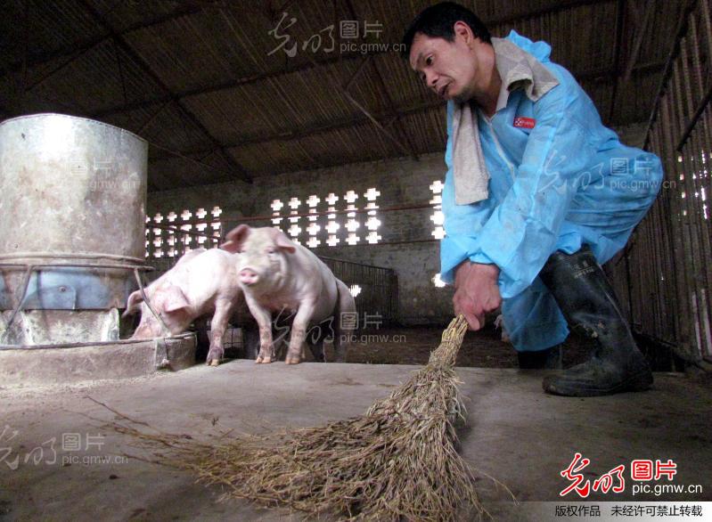 图为行动不便的福生打扫猪舍时一丝不苟。(郝群英)