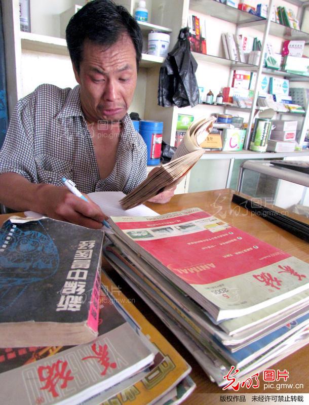 图为闲暇时,福生就会看养猪方面的书籍,并认真做笔记。(郝群英)