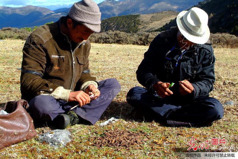 虫草又称冬虫夏草,是一种传统的名贵滋补中药材,与天然人参、鹿茸并列为三大滋补品。虫草主要生长在海拔4000米左右的森林草甸或草坪上,每年大地回春的时候,青藏高原的冰雪缓慢融化,就是挖虫草的季节。每年5月至7月中旬是挖虫草的旺季,我国冬虫夏草主产区各县城,这时候都会迎来浩浩荡荡的“挖草大军”。而中国人对名贵中药材的炒作,只会让“挖草大军”有增无减。飞涨的虫草价格对于凉山州木里的农牧民人均收入起着重要的作用,俗语说:靠山吃山,靠水吃水。冬虫夏草无疑就是上天送给木里农牧民的礼物。虫草是当地农牧民重要的收入来源,每家一个虫草季大概有万把块钱的收入,家里吃的油盐,穿的衣物,添置家电、家具都要靠虫草的收入。当然挖虫草也很辛苦,要在潮湿阴冷的草甸上爬来爬去的,时间长了手和膝盖都遭不住。每年的五月中旬木里麦日乡的村民举家上山挖虫草。挖虫草是当地农牧民重要的收入来源。(张小摄/光明图片)