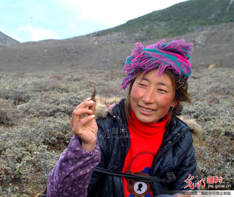 虫草又称冬虫夏草,是一种传统的名贵滋补中药材,与天然人参、鹿茸并列为三大滋补品。虫草主要生长在海拔4000米左右的森林草甸或草坪上,每年大地回春的时候,青藏高原的冰雪缓慢融化,就是挖虫草的季节。每年5月至7月中旬是挖虫草的旺季,我国冬虫夏草主产区各县城,这时候都会迎来浩浩荡荡的“挖草大军”。而中国人对名贵中药材的炒作,只会让“挖草大军”有增无减。飞涨的虫草价格对于凉山州木里的农牧民人均收入起着重要的作用,俗语说:靠山吃山,靠水吃水。冬虫夏草无疑就是上天送给木里农牧民的礼物。虫草是当地农牧民重要的收入来源,每家一个虫草季大概有万把块钱的收入,家里吃的油盐,穿的衣物,添置家电、家具都要靠虫草的收入。当然挖虫草也很辛苦,要在潮湿阴冷的草甸上爬来爬去的,时间长了手和膝盖都遭不住。每年的五月中旬木里麦日乡的村民举家上山挖虫草。挖虫草是当地农牧民重要的收入来源。(张小摄/光明图片)