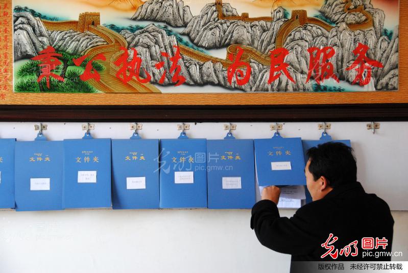 图为法庭负责人蔡国俊在查找办案文件资料。(