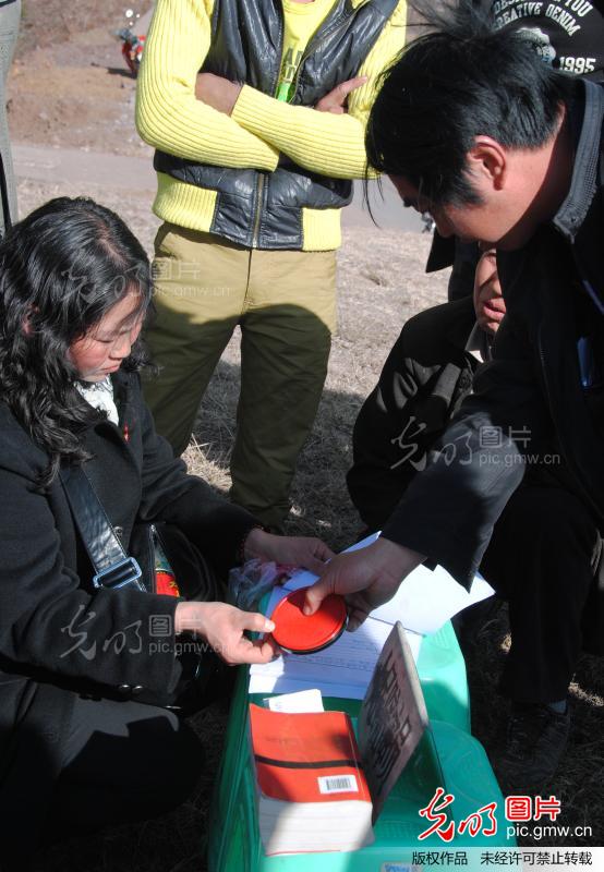 图为一起土地纠纷案件成功处理,原告在协议书上盖手印。(